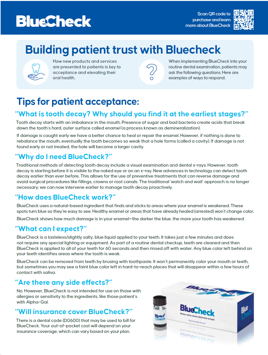Instructions for Use: BlueCheck is intended to be used as an adjunct to routine clinical dental examinations.