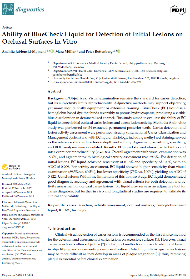 Poster: Jablonski-Momeni A, et al. In-vitro performance of BlueCheck liquid for detection of initial lesions on occlusal surfaces. ORCA, July 2023.